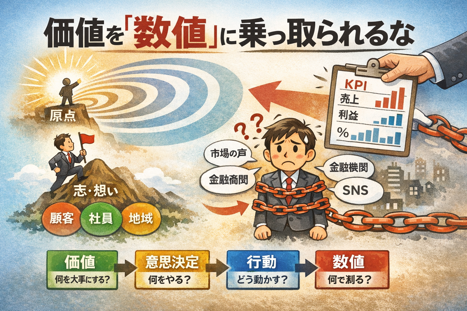 会議が増えて、資料が増えて、指標も増える。会社は成長したはずなのに、なぜか「うちの会社らしさ」が分かりにくくなっていく。この違和感は、あなたの能力が足りないせいではありません。むしろ、経営者として本来やるべき仕事――価値を決め、測り方を決め、行動の優先順位を決める仕事――が、仕組みのせいでやりにくくなっているサインかもしれません。 目次この記事で得られること 経営者の仕事を、もう一度「一言」で言えるようになります。 何を価値と決めるかを…