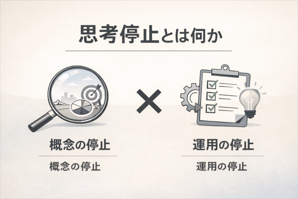 会議が止まる。結論が出ても動かない。いつも同じ議論に戻る。こうした状態を、人は「思考停止」と呼びます。 ただし「思考停止」という言葉は強いので、誰かを責める言葉として使われがちです。けれど経営の現場で本当に重要なのは、個人の能力ではなく、...